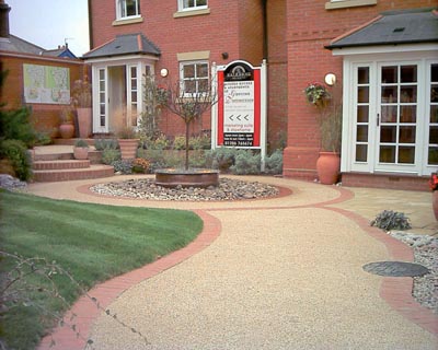 When properly laid over a sound base, resin based surfacing is a superb paving system. There are no loose stones, no weeds to clear out or to soak in 'PathClear'. The colours are light-fast, oil and petrol have no effect on the resin once set and can be simply wiped off. It provides good slip-resistance. It can be used to continue a paving scheme throughout a corporate site, so the that external walkways and internal atriums, foyers and corridors are all the same. There is an almost limitless choice of colours and muti-colour 'blends'. Panels of contrasting colours can be laid, as can all sorts of logos and motifs.
